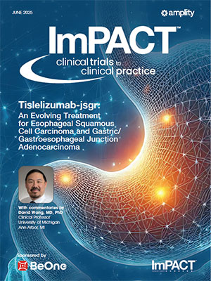 Patients being treated with tislelizumab experienced decreased rates of treatment-related AEs (TRAEs) compared with placebo (18.8% vs 55.8%).17 TRAEs led to treatment discontinuation in 16% of patients in the tislelizumab group compared with 8% in the placebo group.17 Serious AEs occurred in 41% of patients, with the most frequent AEs (≥2%) being pneumonia, dysphagia, hemorrhage, pneumonitis (including pneumonitis and immune-mediated pneumonitis), and esophageal obstruction.11 The most common grade 3 or 4 AEs for both the tislelizumab and placebo groups were similar, including pneumonia (6% vs 7%), anemia (6% vs 11%), dysphagia (6% vs 3%), fatigue (2% vs 6%), abdominal pain (0.8% vs 2%), and vomiting (0.8% vs 4%), respectively.11